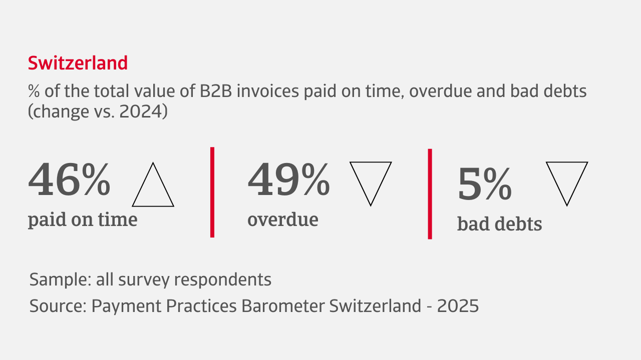 - Companies in Switzerland report ongoing challenges with cash inflows related to B2B trade due to significant impact of delayed payments.